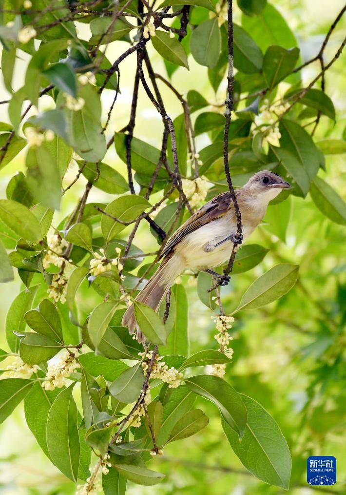9月29日,一只鸟在贵州省仁怀市街边的桂花枝头停歇。