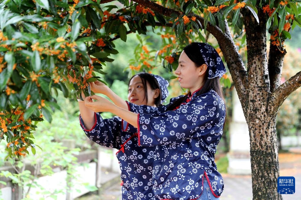 9月30日,游客在四川省泸州市纳溪区丰乐镇桂花基地采摘桂花。