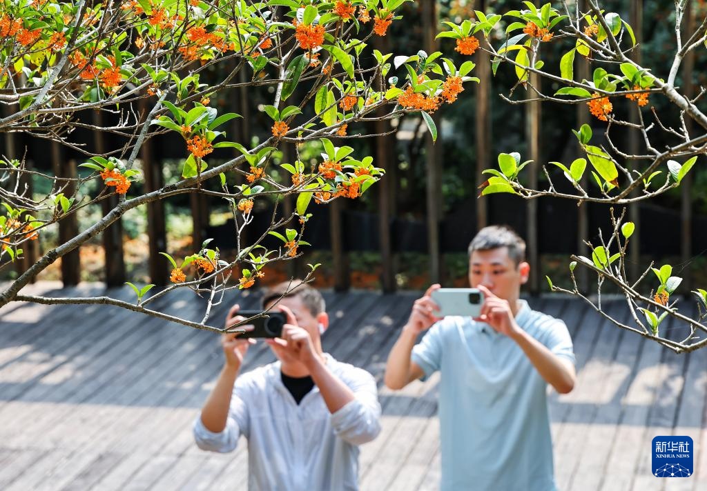 10月4日,游客在江苏省连云港市海上云台山丹桂园拍摄桂花。