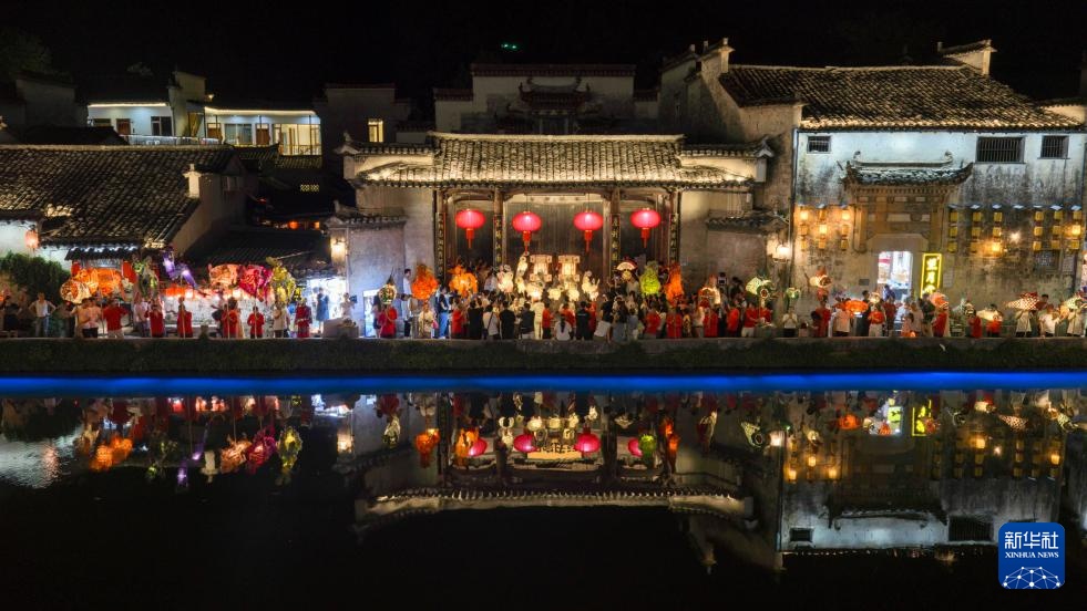 10月6日中秋节,花灯表演队在安徽省黄山市黟县宏村巡游(无人机照片)。
