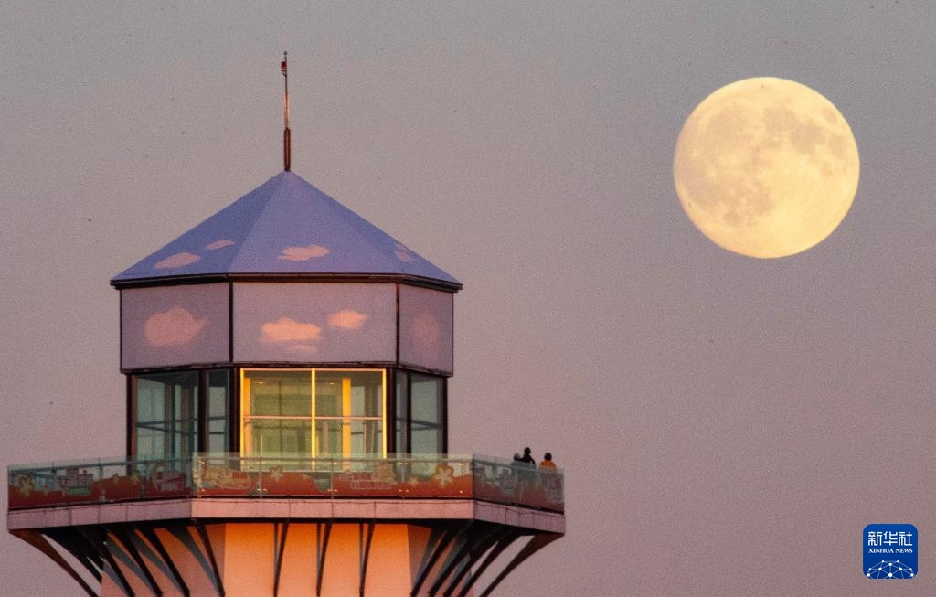 10月6日,人们在黑龙江省佳木斯市富锦市万亩水稻公园观光塔上欣赏中秋满月。