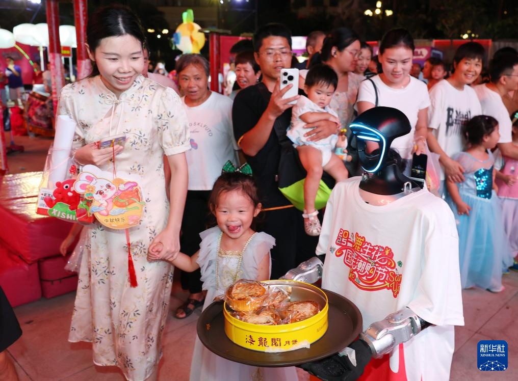 10月6日中秋节,在海南三亚一家购物广场,机器人向市民游客发放月饼。