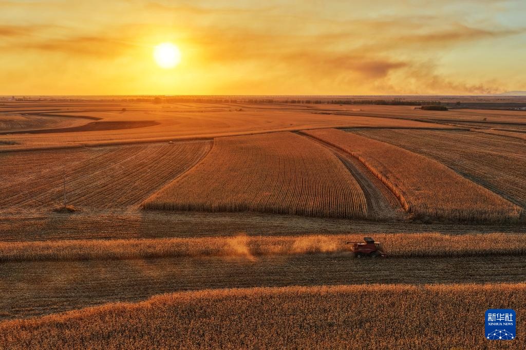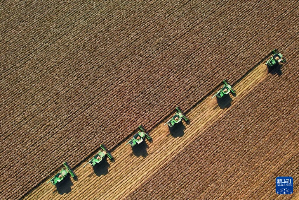 10月6日,在北大荒集团黑龙江大西江农场有限公司第六管理区,大型收割机在收获高粱(无人机照片)。
