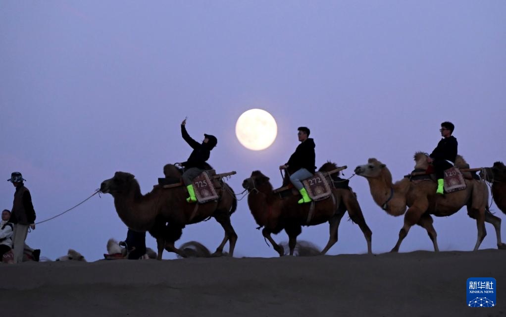 10月6日在甘肃省敦煌市鸣沙山月牙泉景区拍摄的中秋满月。