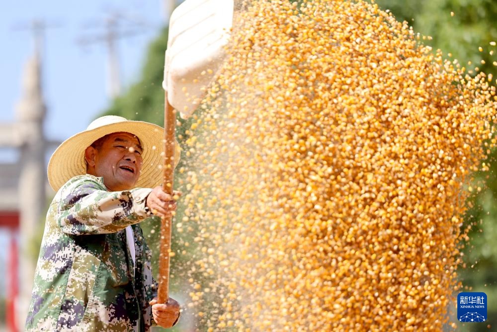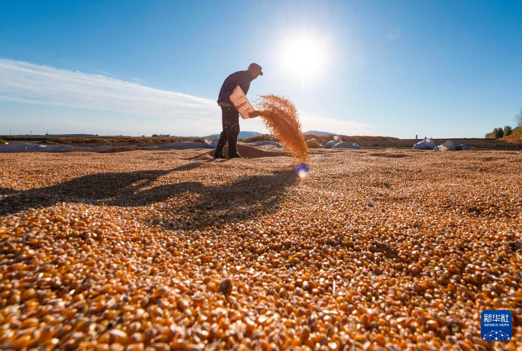 10月5日,在黑龙江省佳木斯市富锦市锦山镇一处晾晒场,村民在翻晒收获的玉米。