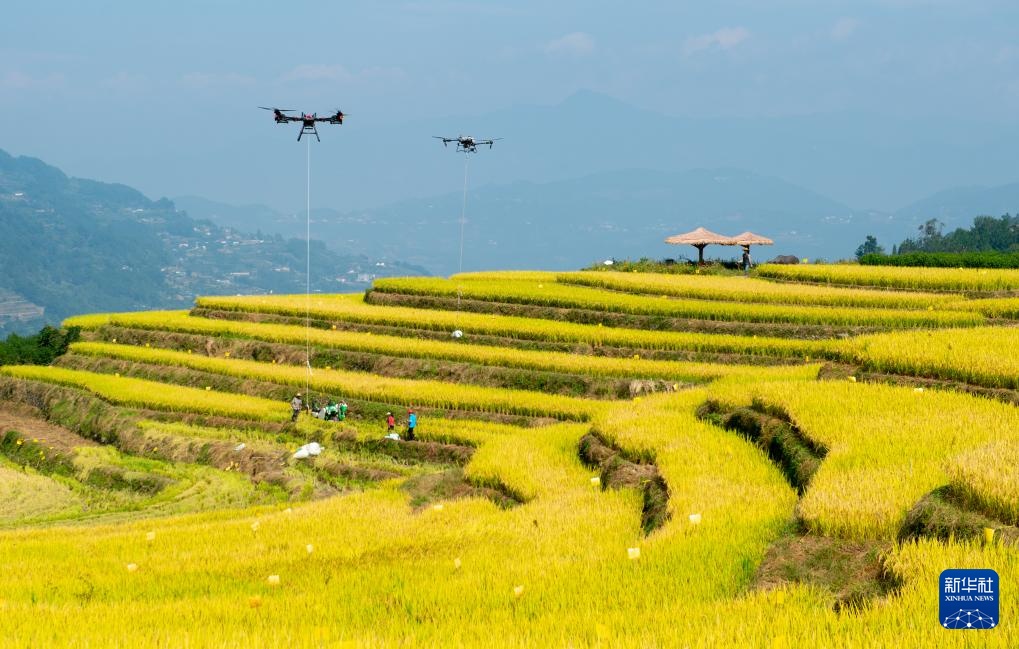 10月10日,湖北省秭归县沙镇溪镇长春村村民用无人机转运收获的水稻(无人机照片)。