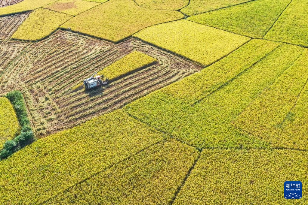 10月12日,在湖南省永州市蓝山县土市镇团结村,村民驾驶收割机收获水稻(无人机照片)。