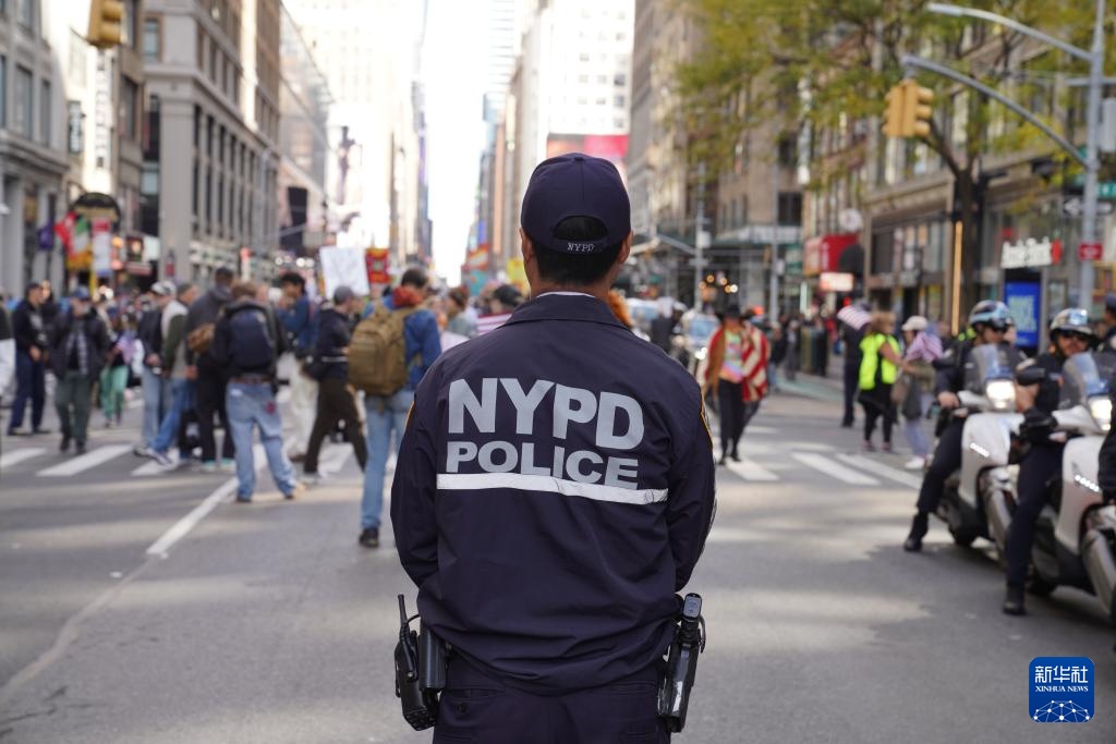 10月18日,在美国纽约,警察在示威游行活动现场执勤。