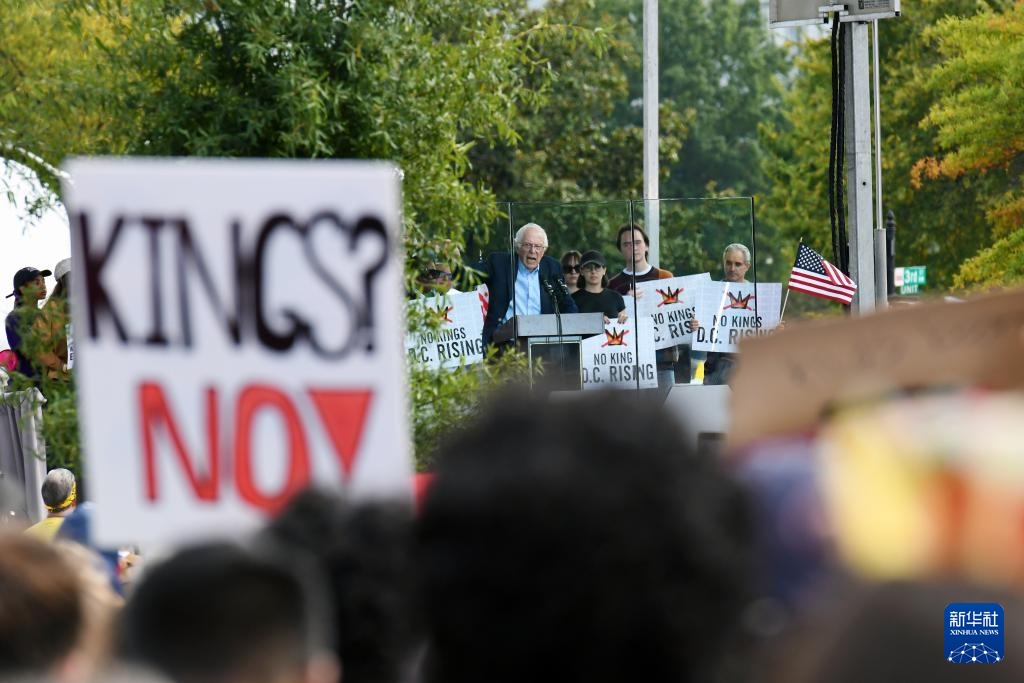 10月18日,在美国华盛顿,美国参议员伯尼·桑德斯(中)在示威游行活动中讲话。