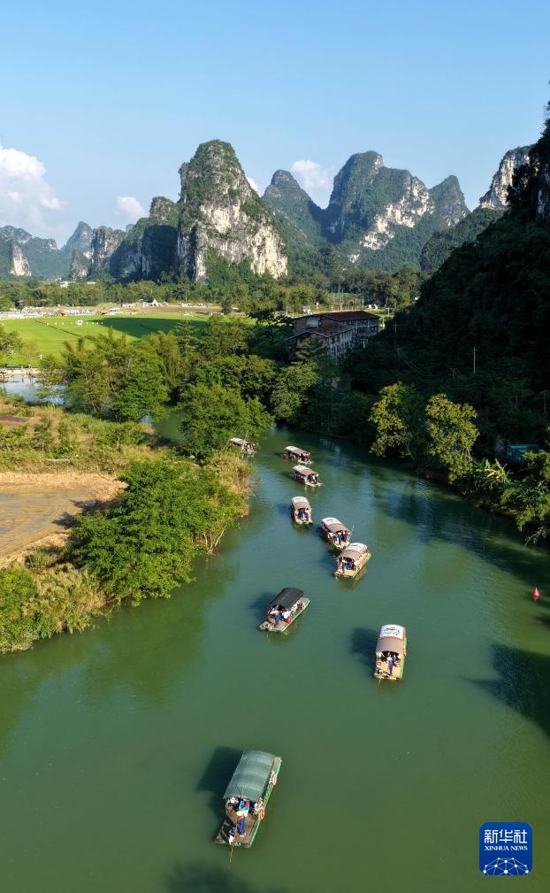 10月18日,在广西崇左市大新县堪圩乡明仕旅游度假区,游客乘坐竹筏在稻田边的明仕河上游玩。