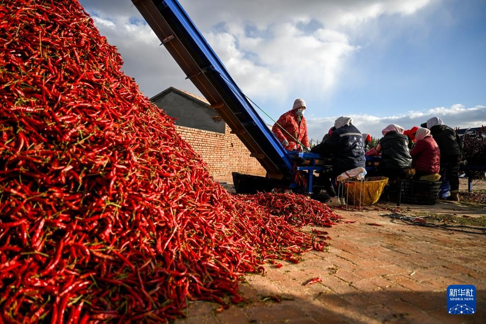10月19日,在通辽市开鲁县东风镇六合堂村,村民在分拣红干椒。