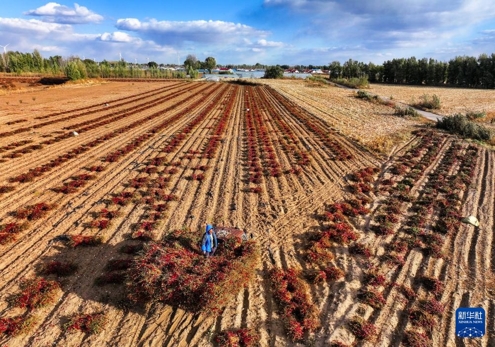 10月19日,在通辽市开鲁县东风镇六合堂村,村民在田地里晾晒红干椒。