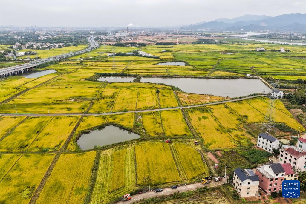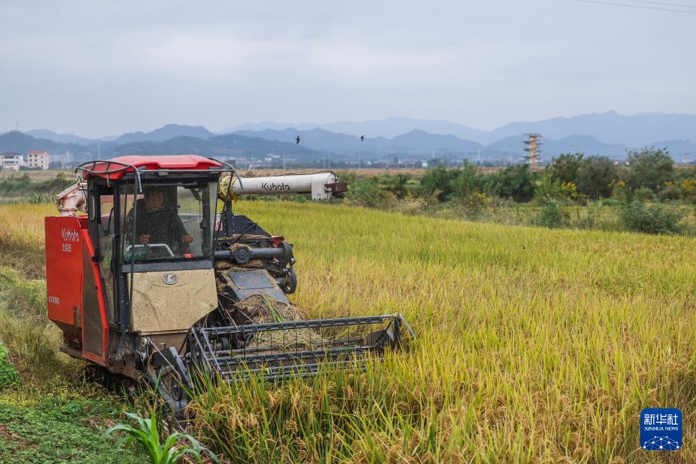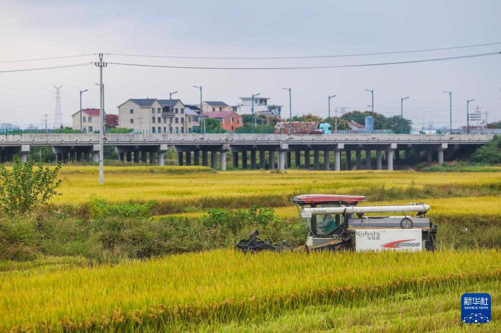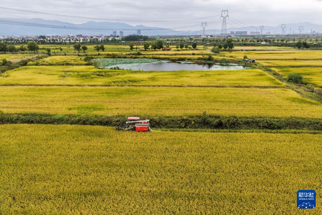 金秋时节,浙江省金华市金东区塘雅镇万亩良田示范区的水稻迎来集中收割期,收割机在稻田来回穿梭,抢抓农时收割水稻。塘雅镇作为金东区最早开展“多田套合”试点的片区,累计建成永久基本农田1万多亩,从育种到收割全程实现机械化、智能化。