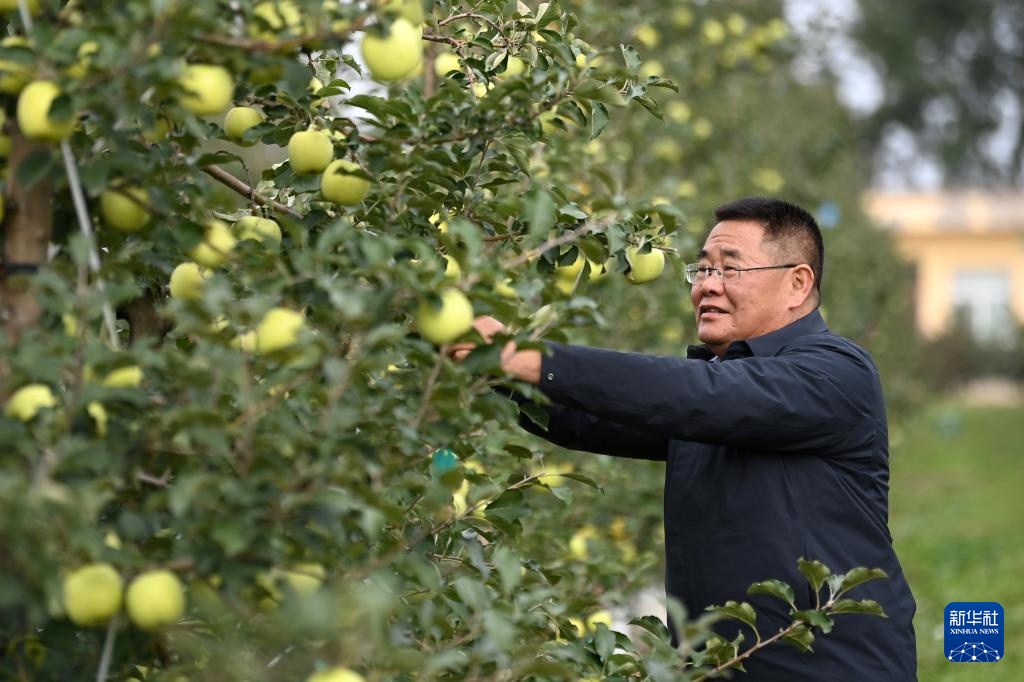 10月21日,西北农林科技大学白水苹果试验站首席专家赵政阳教授查看试验站内“瑞雪”苹果的生长情况。