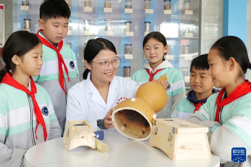 10月21日,在山东省聊城市茌平区成无己纪念馆,老师在给小学生们讲解中医知识。