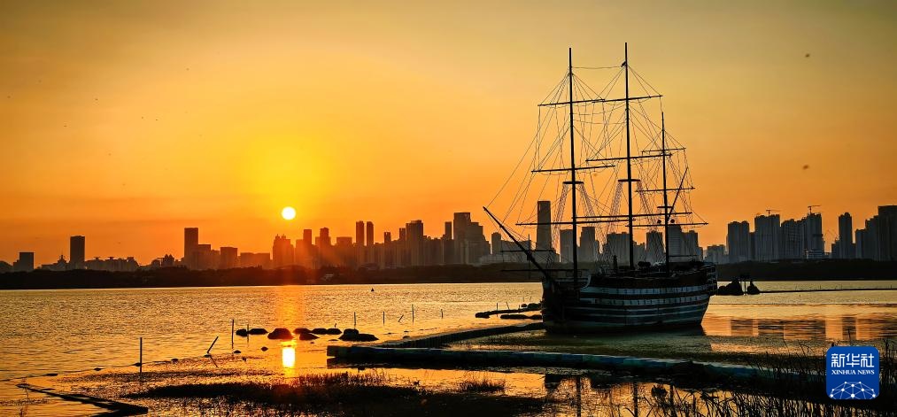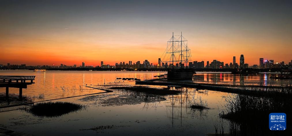 10月22日,湖北省武汉市的东湖风景区在夕阳和晚霞的映衬下,壮美如画。新华社记者 沈虹冰 摄