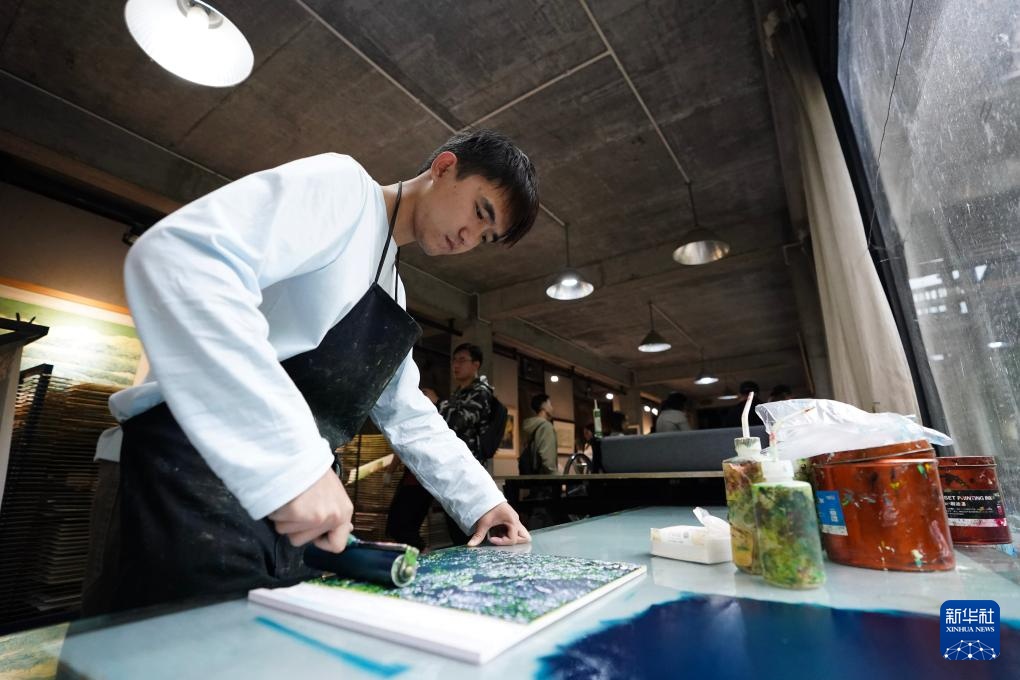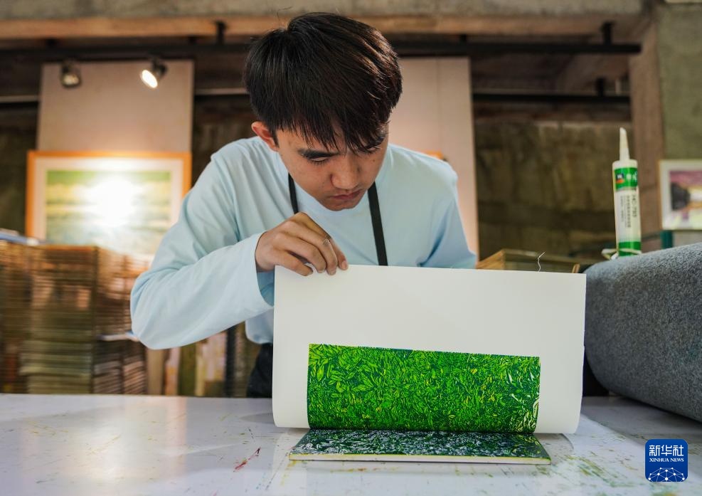 10月22日,在云南普洱学院那柯里绝版木刻教学实践基地,普洱学院艺术学院学生在上色。