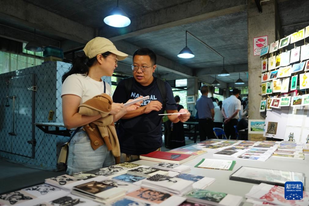 10月22日,在云南普洱学院那柯里绝版木刻教学实践基地,游客在讨论绝版木刻作品。