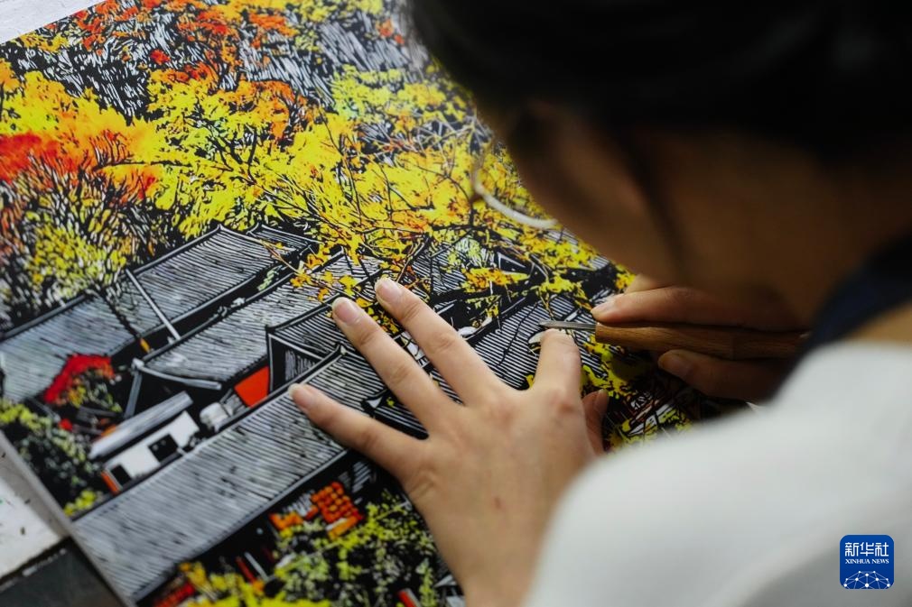 10月22日,在云南普洱学院那柯里绝版木刻教学实践基地,普洱学院艺术学院学生在雕刻。