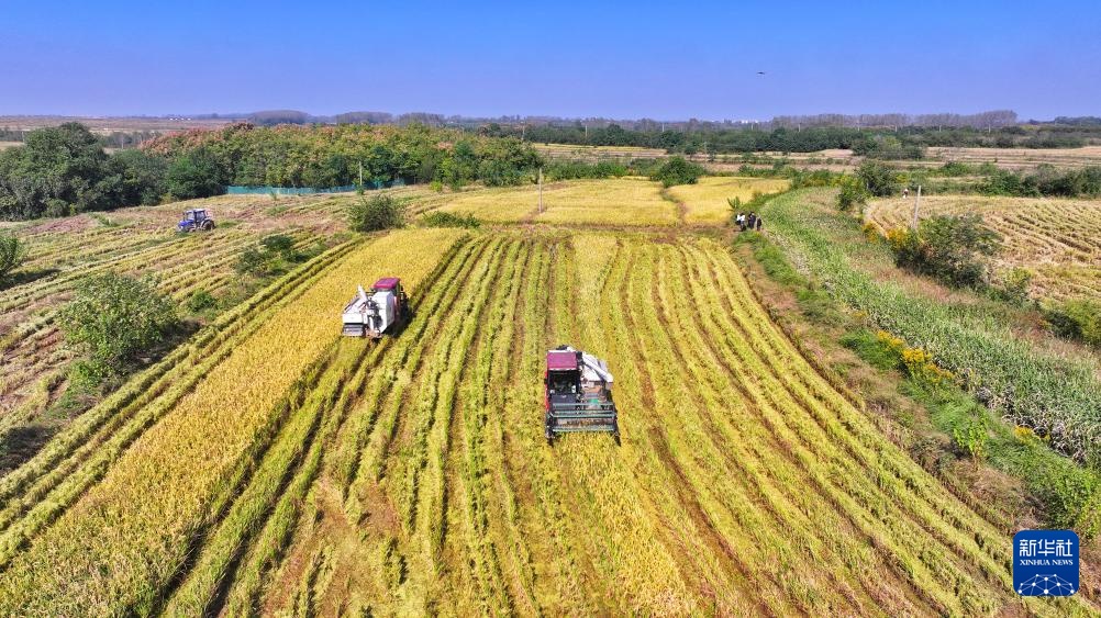 10月23日,收割机在江苏省连云港市灌云县圩丰镇大兴村田间收获水稻(无人机照片)。