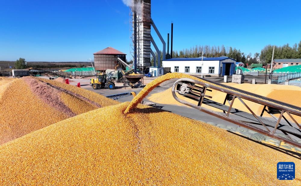 10月23日在北大荒集团黑龙江尾山农场有限公司一烘干企业拍摄的玉米烘干作业现场(无人机照片)。