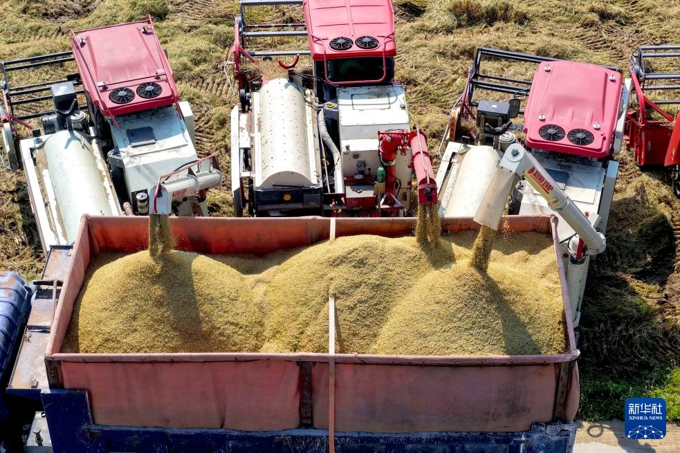10月23日,在安徽省亳州市利辛县马店孜镇双沟社区,农机手将收获的水稻装入运粮车(无人机照片)。