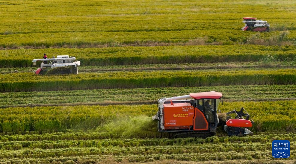 10月23日,农机手驾驶收割机在江苏省昆山市锦溪镇三联村田间抢收水稻(无人机照片)。