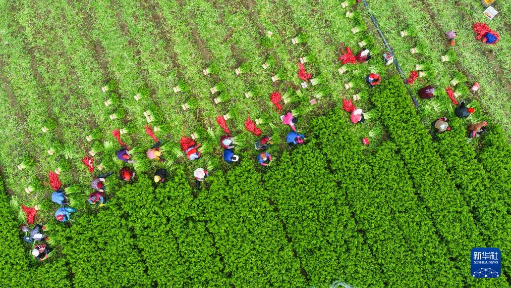 10月23日,农民在山东省东营市广饶县乐安街道一处农田里收割芹菜(无人机照片)。