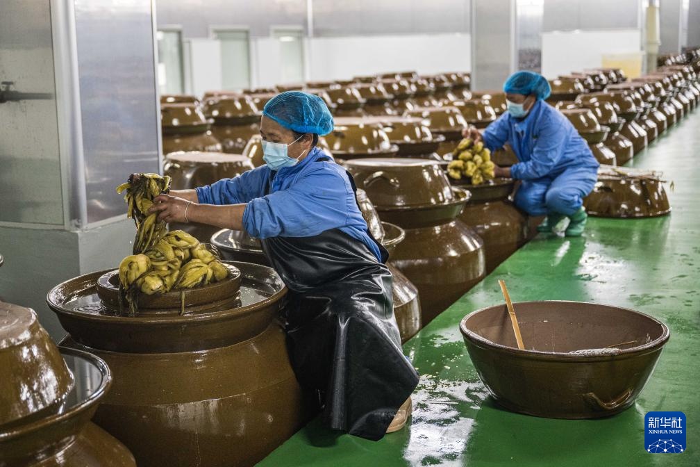 10月23日,工人在云南省昭通市镇雄县五德镇的赤水源绿色食品加工产业园泡菜生产车间内查看泡菜腌制情况。