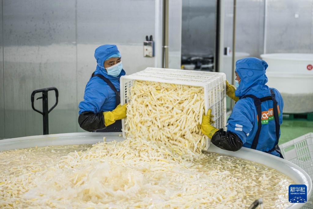 10月23日,工人在云南省昭通市镇雄县五德镇的赤水源绿色食品加工产业园竹笋生产车间内腌制竹笋。