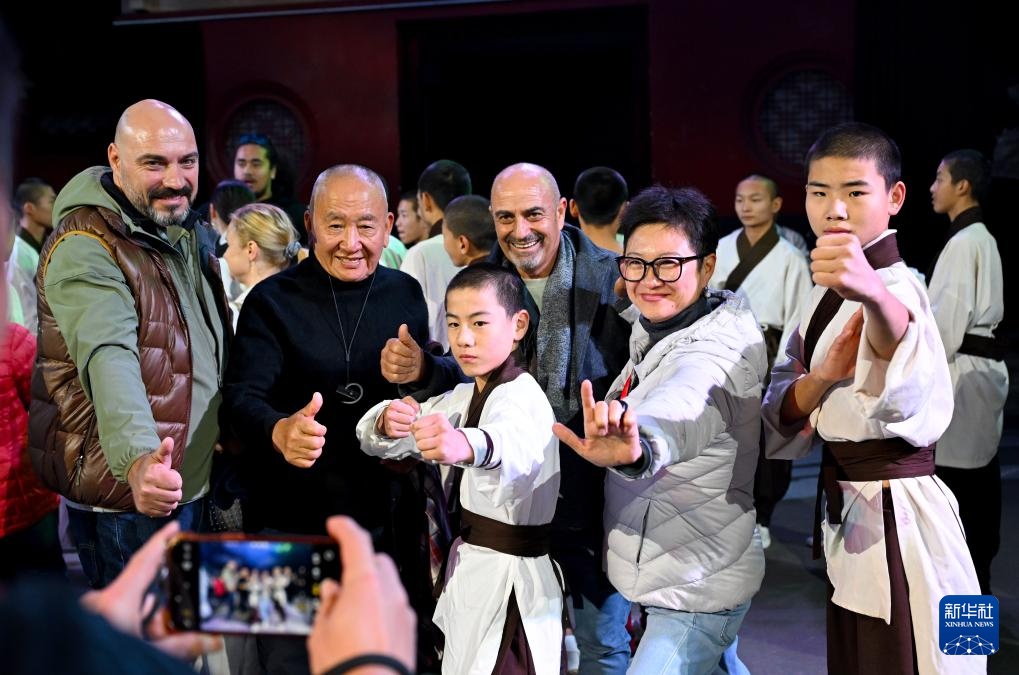 10月23日,嘉宾在少林寺景区观看演出后合影留念。