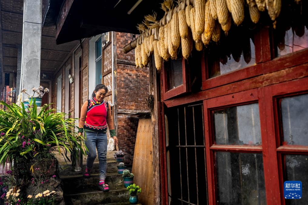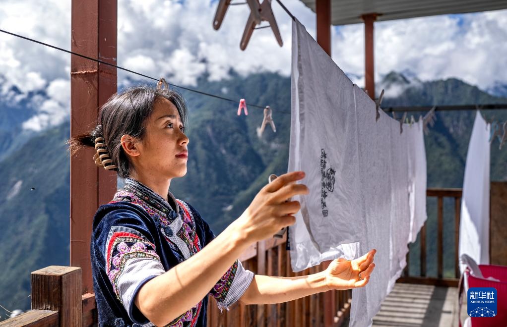 老姆登村村民伍玲丽在自家经营的民宿晾晒浴巾(10月20日摄)。