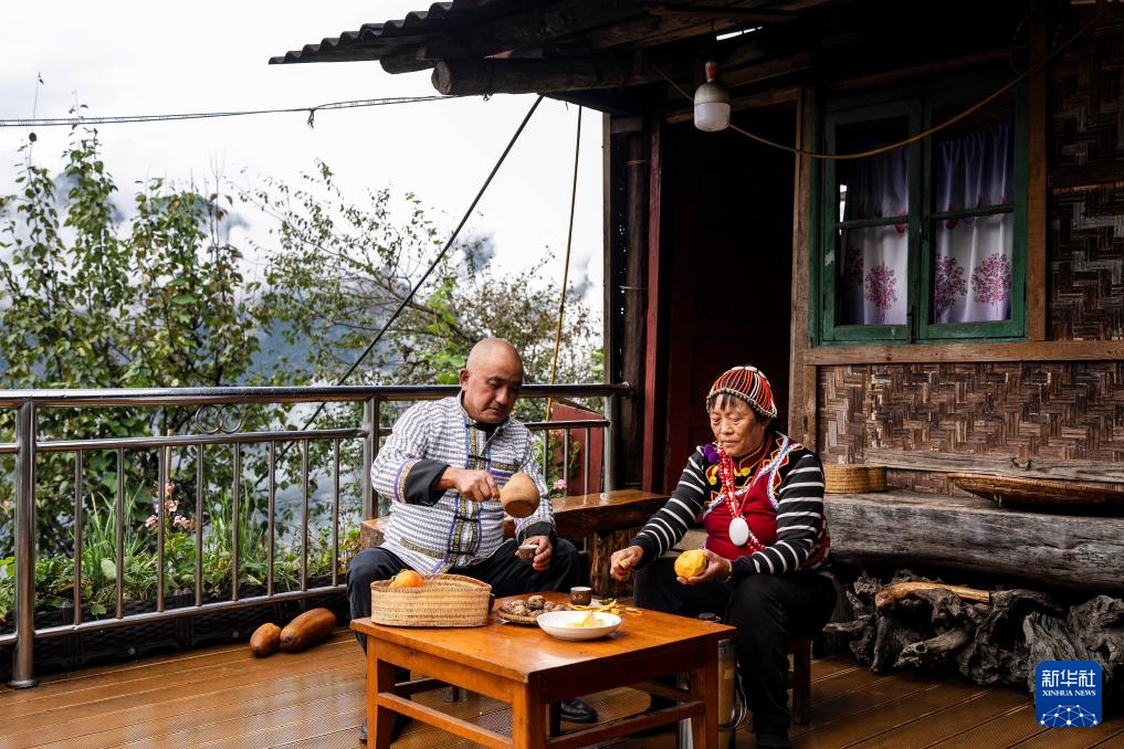 老姆登村村民国庆(左)和妻子桑玛丽在房屋前喝茶聊天(10月20日摄)。