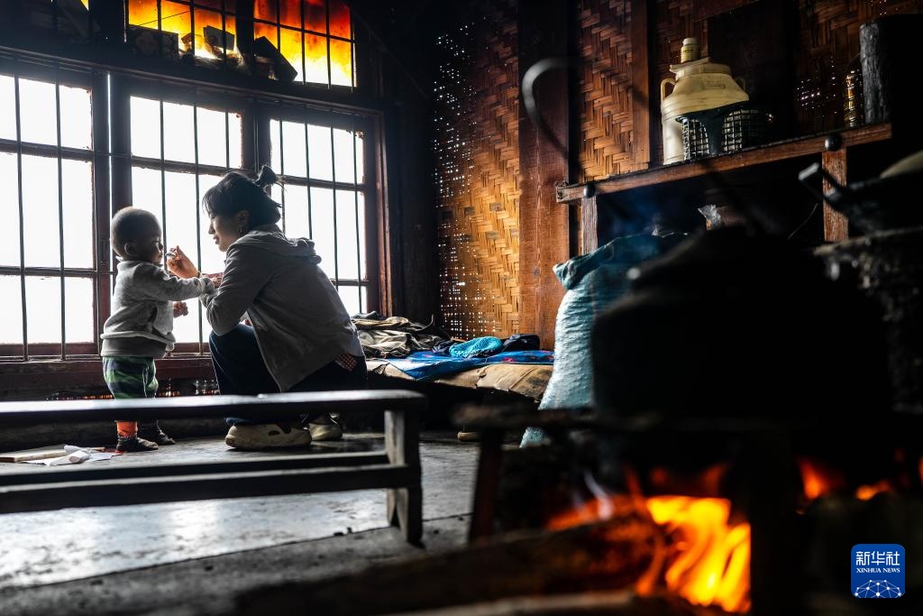 老姆登村村民郁莲在家中的火塘边给孩子喂饭(10月20日摄)。