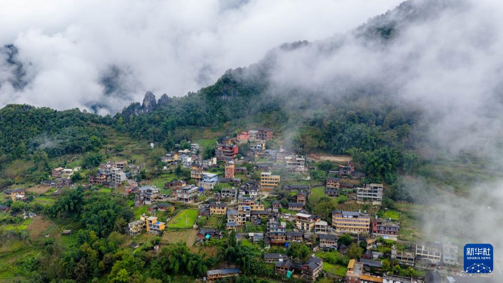 这是云雾环绕的老姆登村(无人机照片,10月20日摄)。