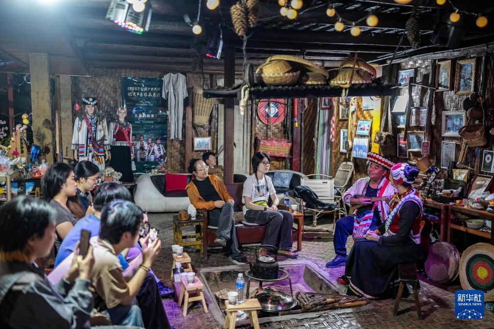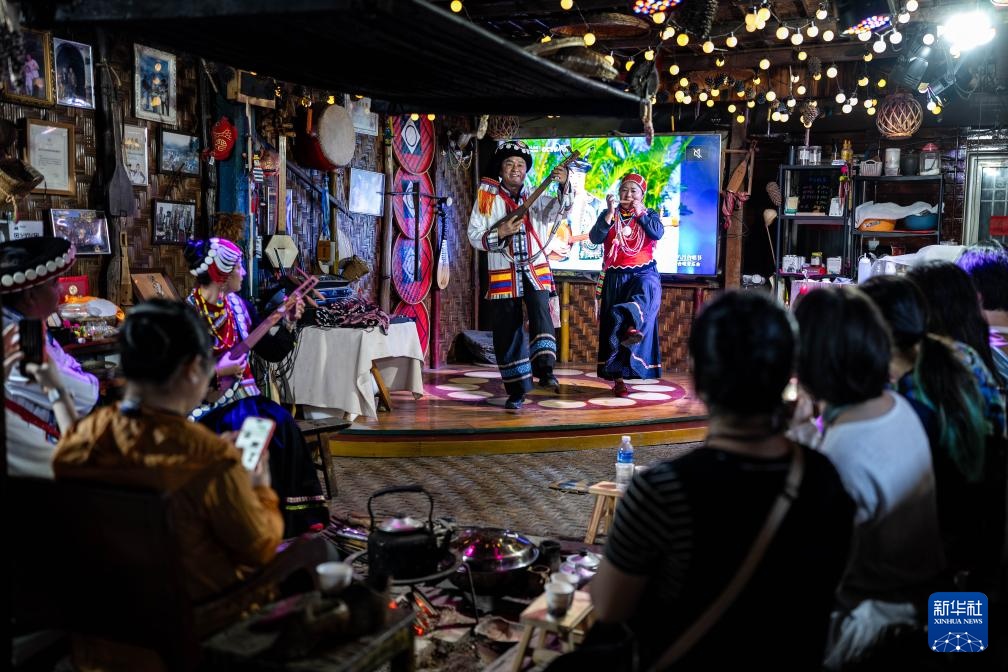 老姆登村村民阿南垮(后左)、杨新妞(后右)在“小慧传习馆”给游客表演节目《火塘恋歌》(10月20日摄)。
