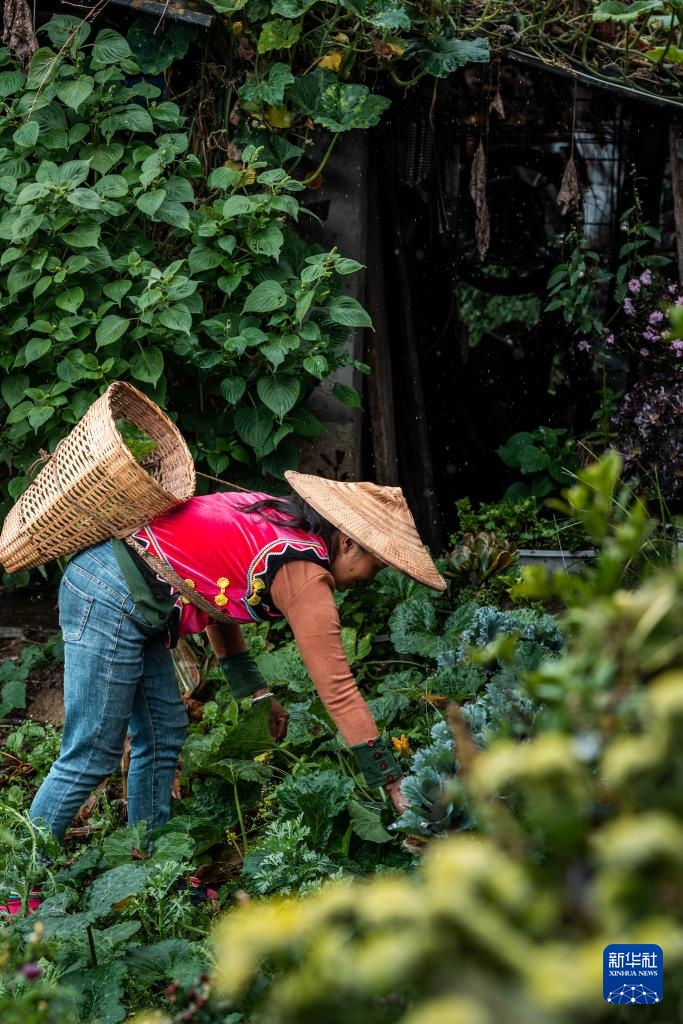 老姆登村村民阿三妞在房屋前的菜地里摘菜(10月20日摄)。