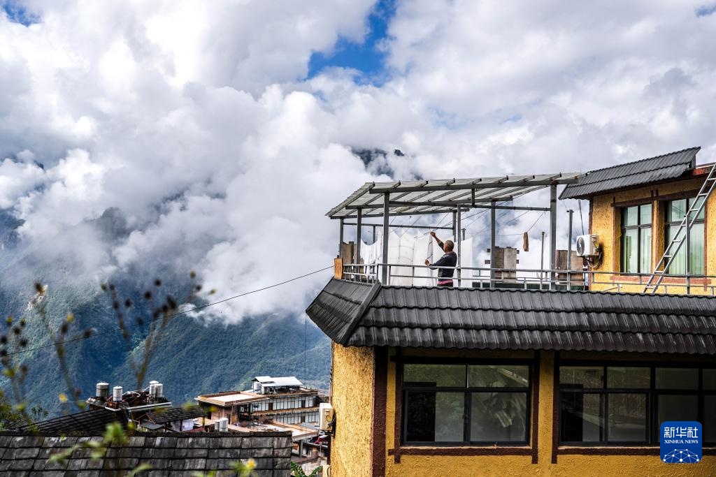 老姆登村村民在民宿楼顶晾晒床单(10月20日摄)。