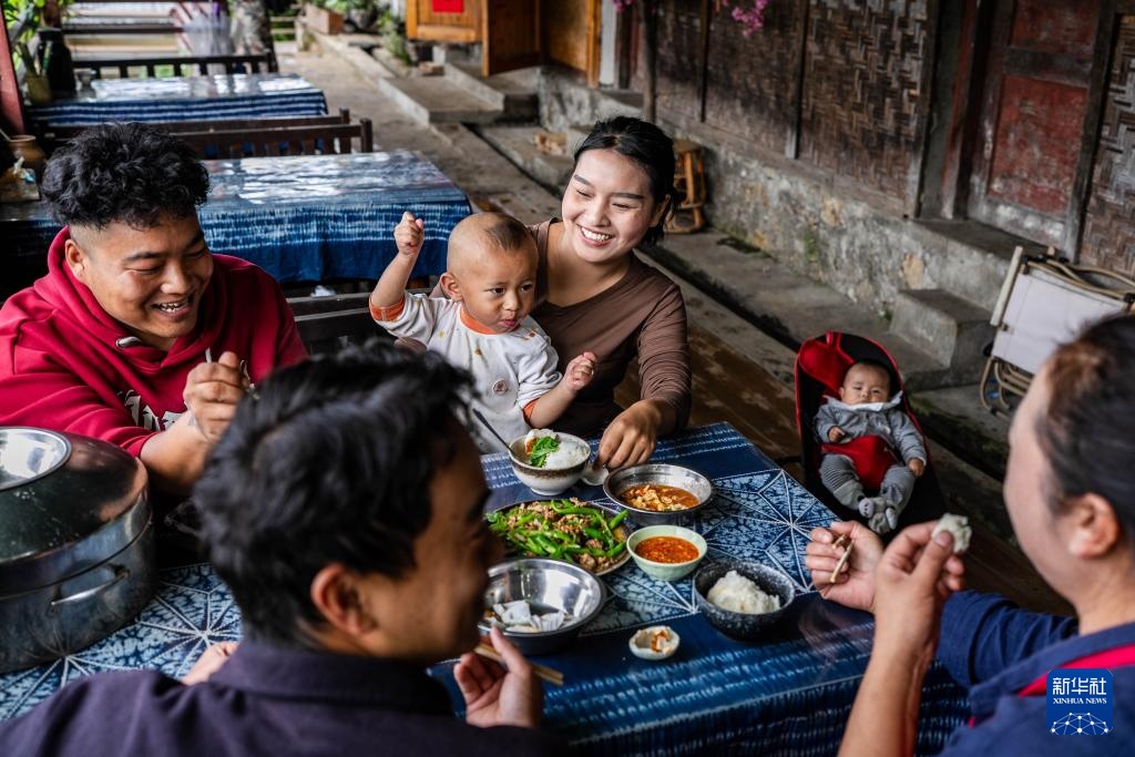 老姆登村村民在自家经营的农家乐吃午饭(10月20日摄)。