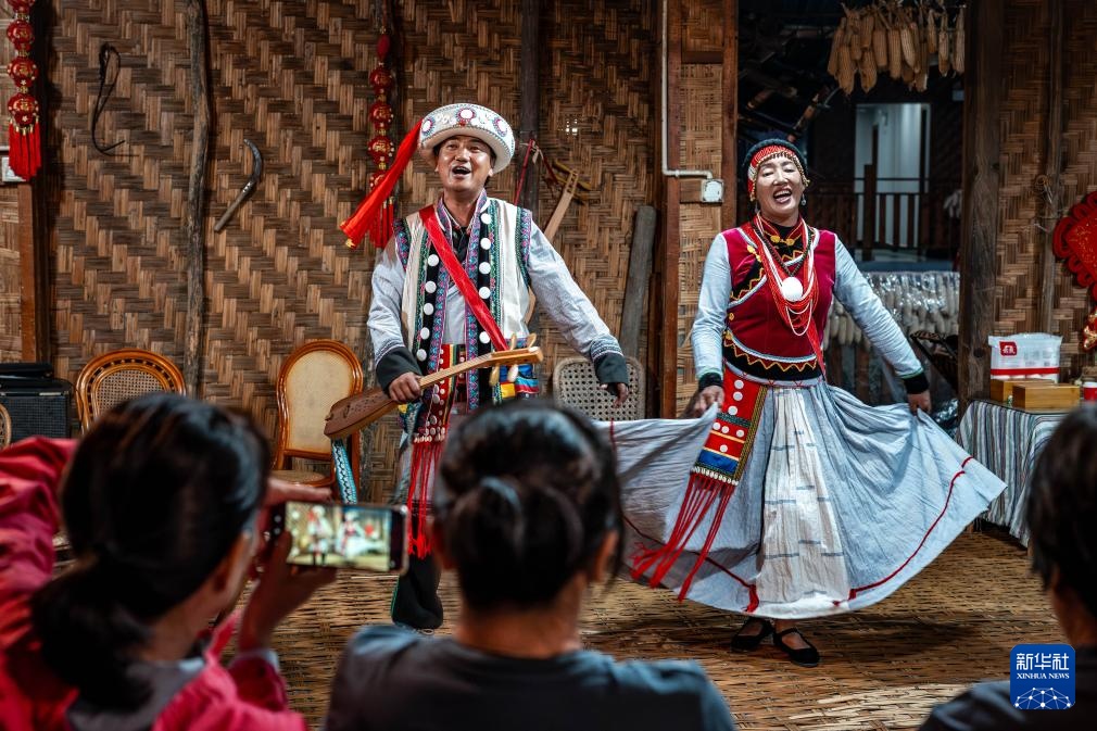 老姆登村村民江晓春(右二)和妻子张晓慧(右一)在“小慧传习馆”给游客表演节目《火塘恋歌》(10月20日摄)。