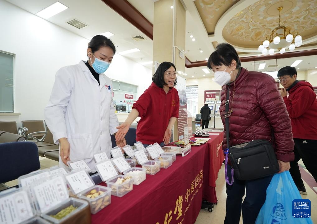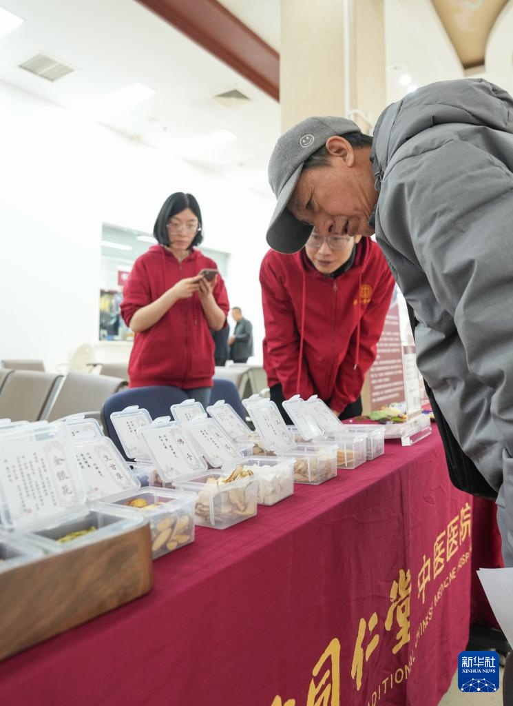 10月24日,在北京同仁堂中医医院,工作人员为市民(右二)介绍各类中药材。