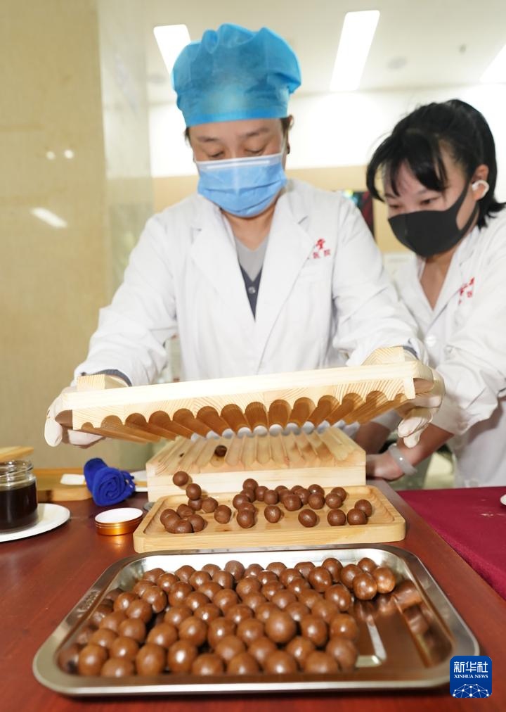 10月24日,在北京同仁堂中医医院,工作人员展示制作山楂丸。