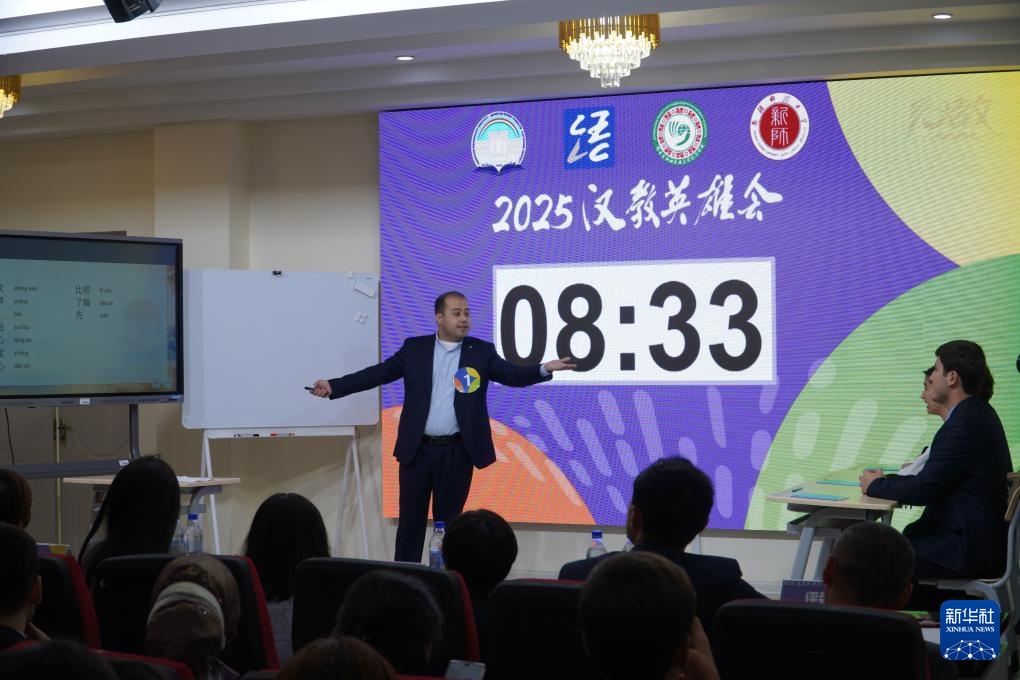 10月24日,在塔吉克斯坦首都杜尚别,乌兹别克斯坦塔什干国立东方大学孔子学院教师绍科西姆·绍鲁斯塔莫夫(中)在比赛中进行教学展示。