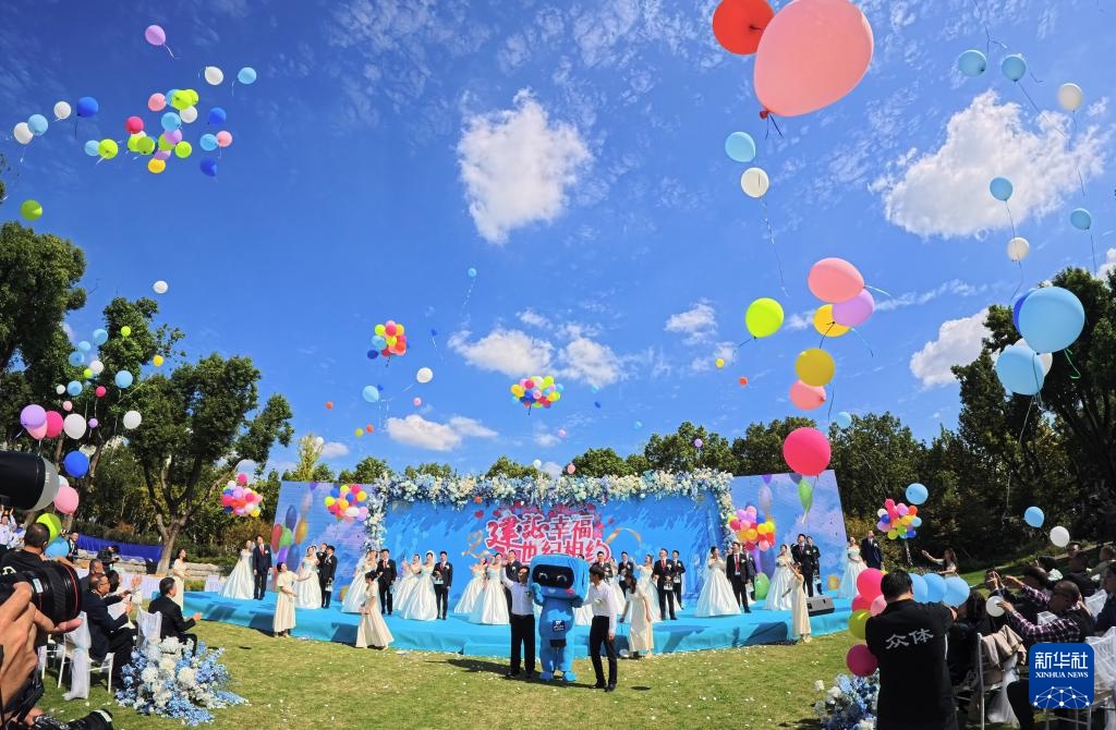 10月25日,新人们在集体婚礼现场放飞气球。