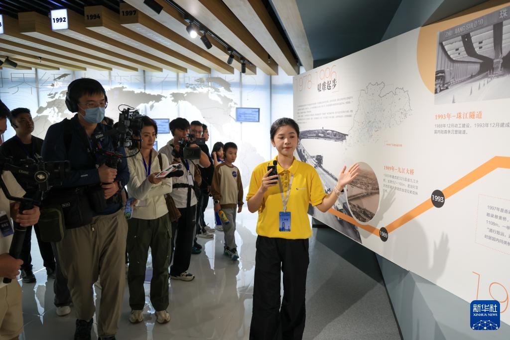 10月25日,游客和记者在深中通道西人工岛上的粤港澳大湾区跨海通道科普基地内参观。