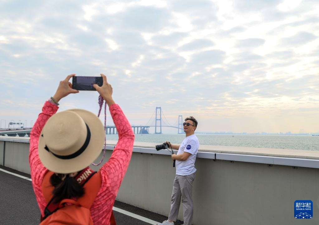 10月25日,游客在深中通道西人工岛中庭的观景平台拍摄深中大桥。