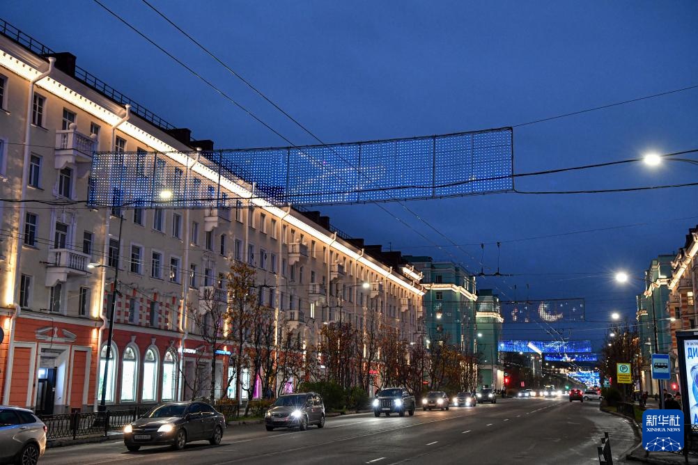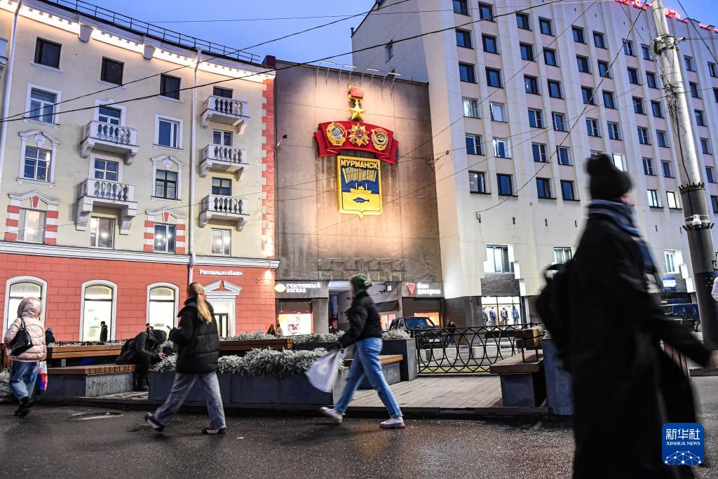 这是10月24日在俄罗斯摩尔曼斯克市拍摄的街景。图中建筑上装饰有摩尔曼斯克市市徽、“英雄城市”等标志性图案。