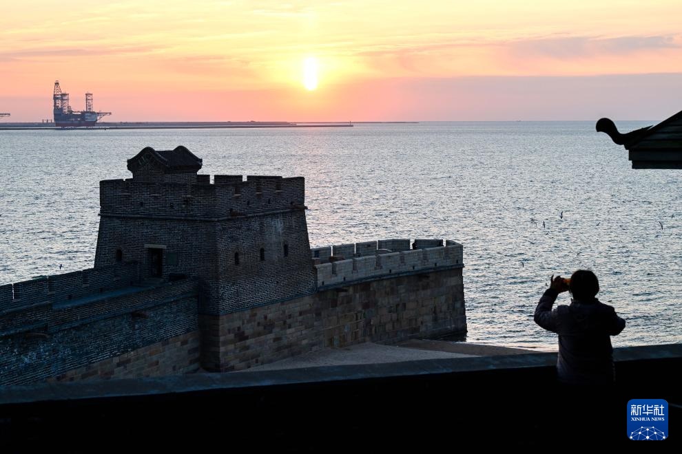 10月26日,沐浴在晨光中的河北秦皇岛山海关老龙头,与海面光影交错,尽显雄浑气象。