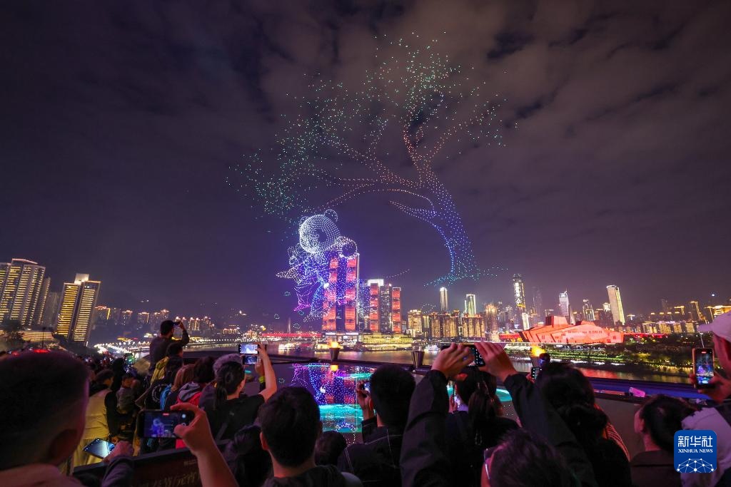 10月27日晚,“新韵重庆”无人机灯光秀举行世界城市日专场表演活动,数千架无人机以“人民城市 智绘未来”为主题,在重庆夜空勾勒出智慧与温情交织的城市图景。