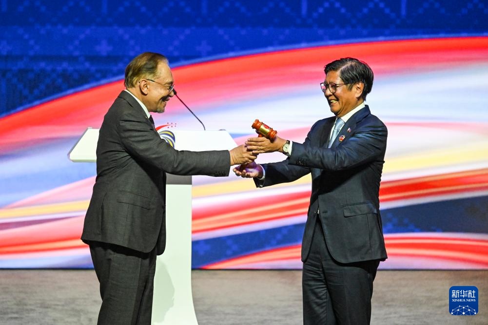 10月28日,在马来西亚吉隆坡举行的第47届东盟峰会及系列会议闭幕式上,马来西亚总理安瓦尔(左)将轮值主席国木槌移交给2026年东盟轮值主席国菲律宾总统马科斯。